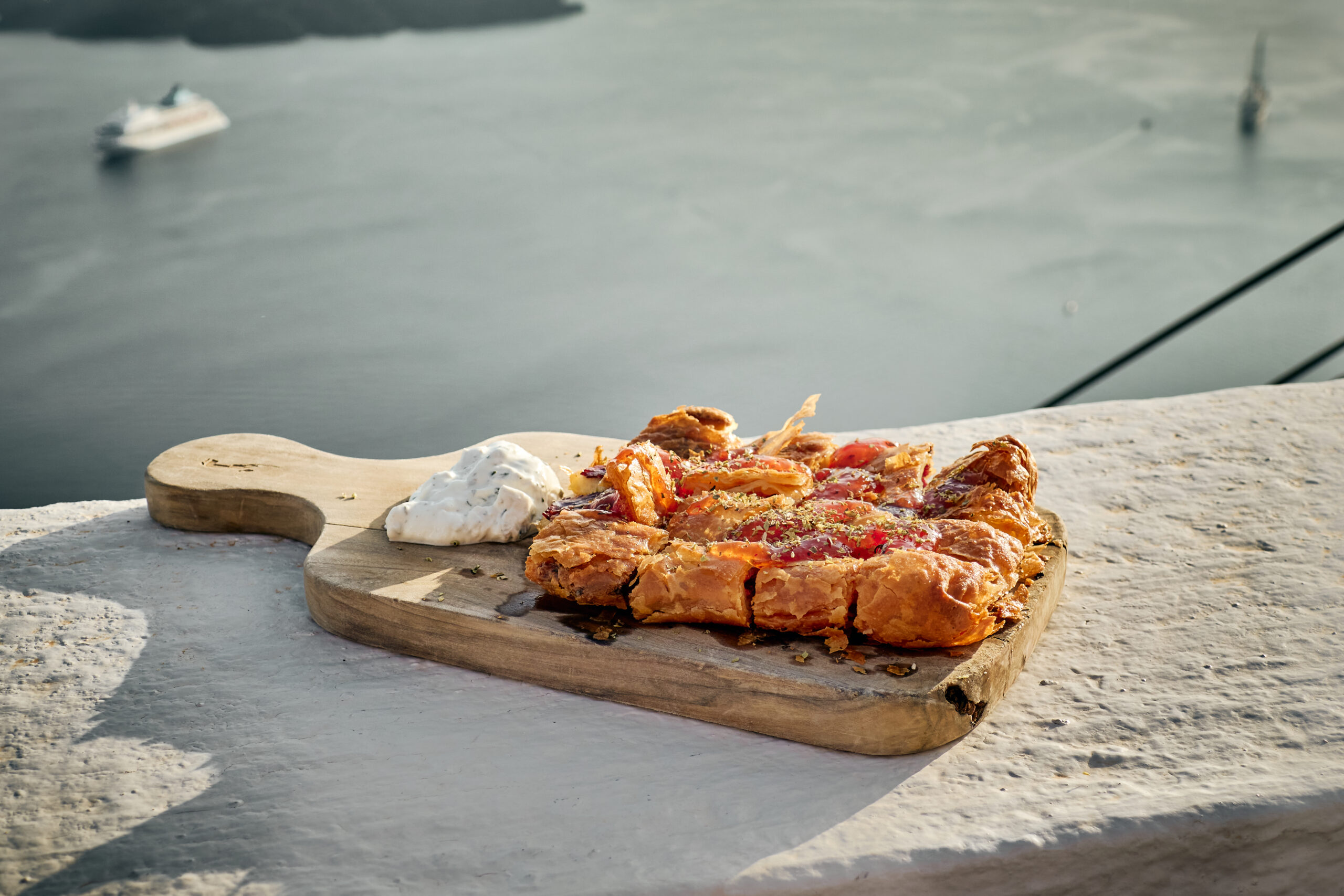 Leckeres Essen auf einem Holzbrett auf einer Mauer in Santorini
